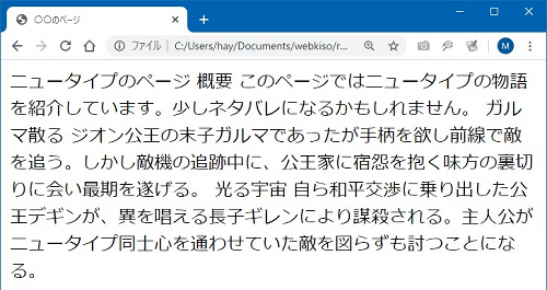 プログラミングは、案ずるより産むがやすしなので、さっそく試してみたいと思いますが、そのために開いている「ren04.html」に以下を入力しましょう。入力は普通文だけなのでコピペでいいです。基本タグの<body>と</body>の間です。テキストエリアの文字を選択して[Ctrl]+[c](コピー)、テキストエディタで[Ctrl]+[v](貼り付け)でサクッといきましょう。 あとついでにタイトルタグのところも「〇〇のページ」としています。適当に名前とか入れておきましょう。そして下のイメージの通り入力できたら、[Ctrl]+[s]で上書き保存、ブラウザを[F5]キーで更新します。どうなるか予想できますよね。文字を入力しただけなので、何の構造もない文字の羅列になります。テキストエディタ上での改行は無視されるんでした。 ![]() ![]() そしてここからが本番。この文字の羅列に「構造」を与えていきます。同じようなことを前にも改行<br>タグでやりましたが、それはインライン要素。文字列を折り返しただけで構造ではありません(インライン要素参照)。ここでは「ブロック要素」ということで、「箱に入れるイメージ」を持ってください。 というわけで、一つづつ編集しながら確認していきます。 SPONSORED LINK