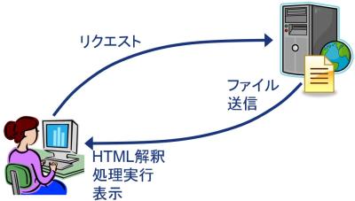 まず、皆さんがブラウザで何かリンクをクリックしたり、URLを打ち込んでウェブページを見ようとすると、ブラウザはウェブサーバーに対し関連するファイルを「送ってくれー」とリクエストを送ります。ウェブサーバーは、そうしたクライアント(皆さんのパソコンやブラウザなどひっくるめた言い方)からリクエストを受け取ると、必要なHTMLやCSS、画像などのファイルをまとめてクライアントに「受け取れー」と「そのまま」送信します。ブラウザは、その受け取ったHTMLやCSSファイルに書かれた内容を解析し、ブラウザ上に文字や画像を表示していきます。全部のデータが揃うと、皆さんの目の前にウェブページが表示される、という仕組みです。 ![]() つまり、ウェブページを見ているとき、受け取ったHTMLやCSSは「ブラウザが処理」して、結果を表示しています。言い換えれば、HTMLやCSSの実行環境はブラウザということになります。ですので、開発環境という意味では、とりあえずパソコンにブラウザがあれば、まずは一つ目の準備完了、となります。普通パソコンにはブラウザがインストールされていますので、この点では何もしなくてよいですね。 >>次のページへ進む