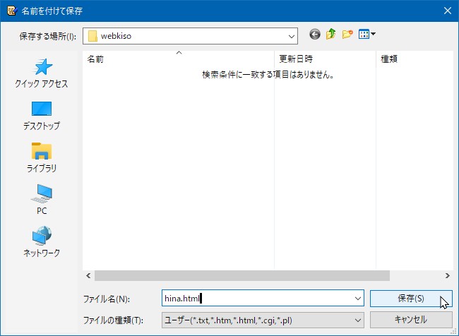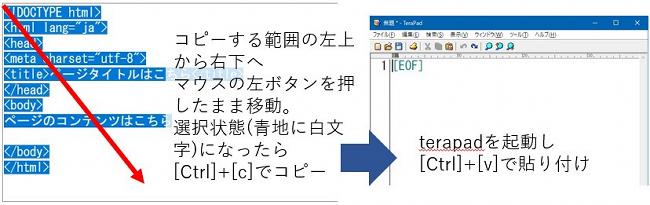 イメージとしては年賀状。最近はあまり出さなくなったかもしれませんが、年賀状の「あけましておめでとうございます」や「自分の住所氏名」の部分は、誰宛てでも同じなのであらかじめ印刷(コピー)しておいて、「相手の住所氏名」や「個別のメッセージ」は、後から手書きで書き加えたりしますよね。全部をいちいち書くのは面倒だからです。ひな型ファイルは、この年賀状の「あらかじめ印刷しておく共通部分」と似ています。 ひな型ファイルの作り方それではさっそく作りましょう。まずはTerapad.exeファイルをダブルクリックしてTerapadを起動します。開いたら、以下のテキストエリアの領域をすべて選んでコピーして、Terapadに貼り付けます。いわゆるコピー&ペースト、略称「コピペ」です。Windows環境限定ですが、一つ便利なコピペの方法をお教えしましょう(Macの人は調べて下さい)。コピペの方法はいろいろありますが、ショートカットが便利です。コントロールキー「Ctrl」と「c」キーの同時押し[Ctrl]+[c]でコピーし、「Ctrl」キーと「v」キーの同時押し[Ctrl]+[v]で貼り付けできます。慣れると非常に便利ですので覚えておきましょう。 それからテキストエリアの文字をすべて選択する方法はわかりますか?ひとつは、テキストエリアの左上から右下へ「マウスの左ボタンを押したまま」マウスカーソルを移動させると反転表示の選択状態になります。もう一つのやり方は、ショートカットを使う方法。テキストエリア内でワンクリックあるいはダブルクリックした後で[Ctrl]+[a]を押すとテキストエリア内の文字だけが反転表示の選択状態になります。その上で[Ctrl]+[c]でコピー、[Ctrl]+[v]で貼り付けです。試してみて下さい。 実際にやってみると次のようなイメージ。上のテキストエリアの左上から右下へ「マウスの左ボタンを押したまま」マウスカーソルを移動させると左下のような選択状態(反転表示)になります。その状態で[Ctrl]+[c]してコピーします。その上でTerapadを起動し、[Ctrl]+[v]するとコピーした内容が貼り付けられて完成、となります。 ![]() 完成するとこんな感じ。意味が分からなくても大丈夫。後で詳しく説明します。 ![]() Unicodeで保存しておくひな型ファイルができたらUnicodeで保存しておきましょう。先のページでも書きましたが、ウェブの世界はUnicodeに統一する方向で進んでいます。ひな型ファイルをUnicodeで保存しておけば、新しいHTMLファイルを作るたびに文字コードを変更する必要がありません。TeraPadのメニューバーの「ファイル」から「文字/改行コード指定保存」を選択します。すると小さいウインドウが表示されますので「文字コード」を「UTF-8N」として「OK」ボタンを押します。以下のイメージです。 ![]() ![]() すると「名前を付けて保存」画面が表示されますので、以下の画面イメージの通り、先に作成した作業フォルダ「webkiso」の中に「hina.html」としてファイルを保存しましょう。 ![]() あと「どうしてもできない!」という人。ひな型ファイル「hina.html」のサンプルを「こちら」にアップしておきますので必要があれば、マウスの「右ボタン」でクリックし「名前を付けて保存」のようなメニューを選んでダウンロードし、webkisoフォルダに保存してご利用下さい。 >>次のページへ進む