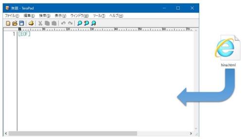 エディタではドラッグ&ドロップで開くHTMLやCSSのファイルなどをテキストエディタで開くときは「ドラッグ&ドロップ」が簡単です。ダブルクリックしてはダメです。HTMLの場合はブラウザが、CSSの場合はメモ帳が起動してしまったりします。Windowsでは、そのようなよくあるファイルとソフト(アプリ)が関連付けられていて、ダブルクリックすると自動的に関連付けられたソフト(アプリ)が起動する仕組みになっています。なので、HTMLやCSSファイルはテキストエディタの上に「ドラッグ&ドロップ」しましょう。やり方は簡単。エクスプローラーの対象ファイルを左クリックしたまま(マウスの左ボタンを押したまま)マウスを移動させて(ドラッグ)、テキストエディタの上でマウスのボタンを離します(ドロップ)。Terapadなら、テキストエディタに編集中のファイルがあってもOK。Terapadに別ファイルをドロップすると、新たなウインドウにそのファイルの内容が展開されます。是非お試しあれ。 ![]() ショートカットを覚えよう最後にもう一つ。プログラミング作業を効率化するためのワザとしてショートカットをご紹介しておきます。プログラミングに限らず、パソコンでレポートを書いたりプレゼン資料を作る際にも絶対役立ちます。すでにひな型ファイルの説明のところでコピペのショートカットを紹介しました。Windows環境の場合ですが、[Ctrl]+[c]でコピー、[Ctrl]+[v]でペースト(貼り付け)でしたね。他にもコピペの方法はありますが、それらよりずっと速くて楽です。 ショートカットは他にもあって、[Ctrl]+[z]で「もとに戻す」ことができますし、[Ctrl]+[s]で「上書き保存」することもできます。上書き保存は、クセにしておくと、常に作業結果が保存されますので、「プログラムを書いている途中でパソコンがクラッシュして保存する前に消えてしまった」ということを防げます。他にもいろいろありますが、これらはプログラミングの最中によく使いますので、ぜひ指に覚えさせましょう。以下はよく使うショートカットの一覧です。