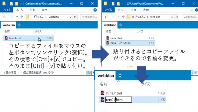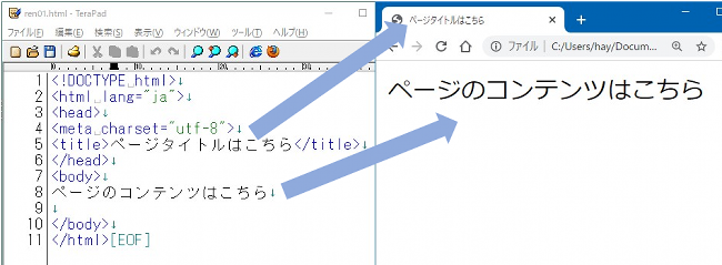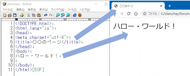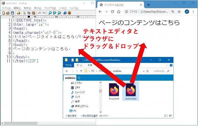 さて、このウェブサイトを順に見てきた人は、既に作ったwebkisoフォルダに保存された、ひな型ファイル「hina.html」をコピーします。下のイメージの通り、エクスプローラーでhina.htmlをワンクリックして選択。その状態でキーボードで[Ctrl]+[c]を押すとコピー。そのまま[Ctrl]+[v]とすると貼り付けられます。うまくいくと「hina - コピー.html」のようなファイルができますので名前を変更します。この後の作業で使うため・・・練習用ファイルということで「ren01.html」と変更しましょう。ファイル名の変更はエクスプローラーで、対象のファイルを右クリックしたメニューから変更できます。 ![]() 変更できたら、テキストエディタとブラウザを起動します。ちなみにブラウザは、ChromeかFirefoxをお勧めしています。 画面上、左にテキストエディタ、右にブラウザの配置を整えます。 その上で、下記イメージのように、エクスプローラから「ren01.html」をテキストエディタとブラウザにドラッグ&ドロップしましょう。ファイルが展開され、テキストエディタには「ren01.html」の中身が、ブラウザには「ren01.html」の表示結果が確認できます。ちなみにサンプルイメージのHTMLファイルのアイコンがFirefox(黒字にオレンジのキツネ?)になっていますが、これはこの資料を作成したPCの設定で、HTMLファイルとFirefoxが関連付けられているからです。これはパソコンによって違うので違ってもご安心を。 ![]() 開いたら少し確認しましょう。HTMLとブラウザ表示の関係をよく確かめて下さい。といっても、ほとんど内容はありませんが、titleタグに入っている内容と、bodyタグに入っている内容が、ブラウザの表示と対応しているの、わかりますか。 ![]() では一つ試してみましょう。 以下のイメージをよく見て、titleタグの内容を「○○のページ」(○○は皆さんの名前とか好きなものとか何でもOK)に変えてみて下さい。また、bodyタグも「ハロー・ワールド!」(他のワードでもOK)と変えてみましょう。 SPONSORED LINK