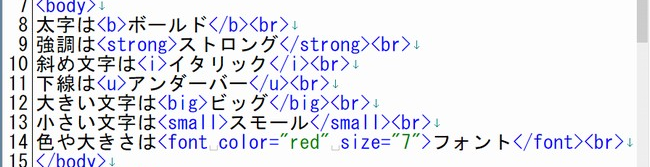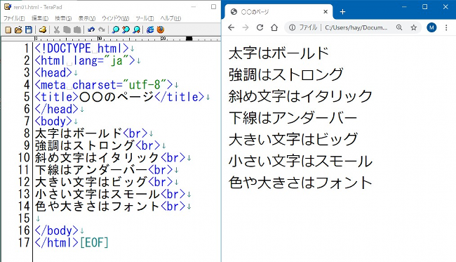 それでは、改行タグを追加してみましょう。以下のように<br>タグを追加して[Ctrl]+[s]で上書き保存。ブラウザで[F5]キーで更新してみて下さい。改行されたらOKです。改行されなかったら、テキストエディタで保存したか、半角で「<br>」を書いたか、サンプル通りになっているか、よくチェックしましょう。おかしくなったら[Ctrl]+[z]を必要なだけ押して修正前まで戻して、上書き保存すれば元に戻ります。 ![]() 文字装飾のタグ文字装飾のタグについて見ていきましょう。文字装飾のタグには以下のようなものがあります。