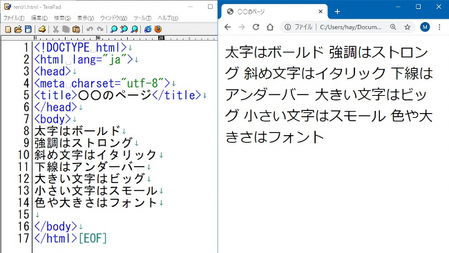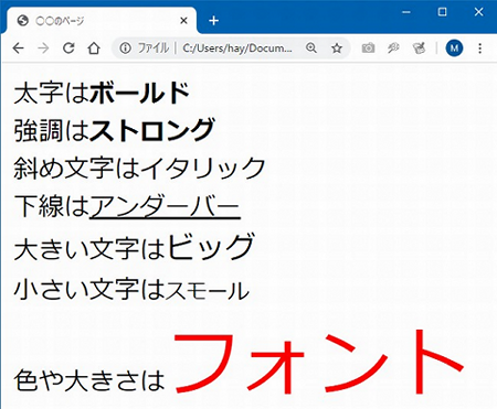 試した方が早いので、既に開いている「ren01.html」の内容を以下のように修正してみましょう。半角文字を使って間違えないように入力して下さい。それぞれ開始タグと終了タグがありますので、特に終了タグを忘れないように。標準的な日本語キーボードなら、終了タグの「/」(スラッシュ)は、キーボードの右下の方「?」が書かれているキーで入力できます。<font>タグの中にある「"」はダブルコーテーションですが、[Shift]キーを押しながらキーボード左上の数字の「2」のキーを押すと入力できます。たまにダブルコーテーション「"」を、間違えてシングルコーテーション(正しくはアポストロフィ)「'」を2個続けて「''」と入力して「size=''7''」とやる人がいますのでご注意を。実際に入力したイメージは下にあります。 ![]() 入力が終わったら[Ctrl]+[s]で上書き保存して、ブラウザを更新しましょう。更新は[F5]キーですよ。覚えましたか。 うまくいけば以下のイメージのようになります。それぞれのタグとその結果について確認しておきましょう。 まず太字の<b>タグは見たままの太字。<strong>タグも太字ですが「強調」の意味が含まれます。なので例えば、ページ内の検索して欲しいワードを<strong>タグで囲っておくと、太字になるだけでなく検索されやすくもなるという説もあります。 次に<i>タグ。下のサンプルを見て「斜め文字になってなくね?」と思った人、正解です。実はブラウザの設定によって斜め文字ができないことがあります。このサンプル画像はChromeでの表示ですが、Chromeの初期設定のフォントが斜め文字に対応していないことが原因のようです。ブラウザを変えるとうまく表示されることがあります(実際、FirefoxとIEで試したところ斜め文字になりました)。解決策としては、ページのフォントを、HTMLやCSSで強制的に、斜め文字対応のフォント(例:MSゴシック)に指定する方法があります。だけど斜め文字のためにそこまでやるか、という話もあります。ウェブ開発で常に付きまとうのは「ブラウザによって表示が変わる」問題です。どうするかはデザイナーの判断です。心のノートにメモっておきましょう。 ![]() 続いて<u>タグ。これは見たまま。アンダーバーということで下線です。 また<big>タグと<small>タグ。これも意味通り。上のイメージ。わずかに文字サイズが大きくなったり小さくなったりしているのがわかると思います。 SPONSORED LINK