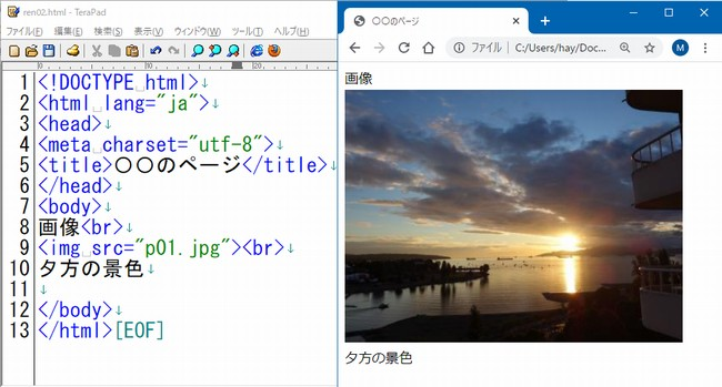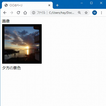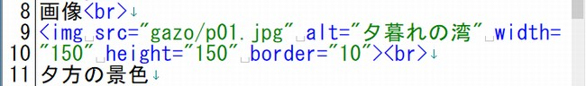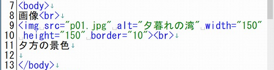 そのためまずは画像ファイルが必要になります。練習用の画像はこちらを右クリックして「ファイルに保存」を選び、名前を付けてwebkisoフォルダに保存して下さい。画像ファイル名はそのまま「p01.jpg」です。保存したら、テキストエディタで開いているren02.htmlに次のように書き込みます。書き込む場所は<body>~</body>の間ですよ。 ![]() 実際の入力イメージは上の通り。追加したのは「画像」という文言に改行タグ<br>、そして<img>タグと改行タグ<br>、そして「夕方の景色」という文言です(ついでにタイトルタグの内容も変更してます)。文字と画像の間に<br>が入っているのは、画像も文字と同じ扱いになるため、改行タグが入っていないと横並びになってしまうからです。 <img>タグは、イメージタグ。画像を表示する際に使います。<img>タグには、</img>のような終了タグはありません。src属性は、ソースということで、表示する画像ファイルを指定します。入力が終わったら[Ctrl]+[s]で上書き保存して、[F5]キーでブラウザの表示を更新しましょう。右上のイメージのようになりましたか。 ところで、画像を単に表示するだけならこれでOK。でも属性がいくつかあります。以下の表を確認して下さい。