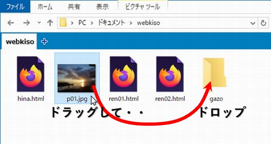そこでまず、エクスプローラでwebkisoフォルダを開き、何もないところで右クリック。ポップアップメニューから「新規作成」-「フォルダ」と選んで下さい。すると「新しいフォルダ」というフォルダができるので名前を「gazo」と変更します。このフォルダ名はこれに決まっているわけではありませんが、この資料ではこの名前をずっと使いますので、合わせて「gazo」としておいて下さい。 ![]() 「gazoフォルダ」ができたら、上でダウンロードした「p01.jpg」を「gazoフォルダ」に移動します。方法はドラッグ&ドロップ。マウスの左ボタンで「p01.jpg」をクリックしたまま移動(ドラッグ)し、マウスカーソルを「gazoフォルダ」の上まで移動させてマウスの左ボタンを離します(ドロップ)。すると「gazoフォルダ」の中に「p01.jpg」が移動します。「gazoフォルダ」を開いてみて、「p01.jpg」が入っていればOKです。今後、画像ファイルはこの「gazoフォルダ」に保存するようにしていきます。 ![]() この状態でブラウザを[F5]で更新してみて下さい。どうなりましたか?画像が消えてしまいました。「alt属性」で指定した「夕暮れの湾」がしっかり表示されていますねー。いえいえ、そんなことを確認している場合ではありません。画像を表示しないといけません。 ![]() 画像がなぜ消えたかわかるでしょうか。それは「画像ファイルp01.jpgの保存フォルダを変えてしまったから」です。今までは「ren02.html」と同じフォルダに「p01.jpg」もありましたが、今は「gazoフォルダ」の中に入ってしまいました。そこで、「ren02.html」を次のように修正しましょう。 ![]() どこが修正されたかわかりますか?<img>タグの「src属性」です。修正前は「src="p01.jpg"」となっていましたが、修正後は「src="gazo/p01.jpg"」となりました。お気づきのことと思いますが「p01.jpg」が保存されているフォルダ名を指定したわけです。 うまくいけば元通り。 ![]() SPONSORED LINK