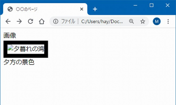 あと、便利だけどあまり使わない方がいいのが「width属性」と「height属性」。元の画像のサイズを変更できるので便利ですが、大きい画像を縮小するとき、画像データは大きいまま送られ、ブラウザが縮小処理をするため、それだけ負荷がかかります。小さい画像を拡大すると、単に引き延ばすだけなので画質が落ちます。つまり、これらの属性を使うなら、最初から画像を適切なサイズにしておいた方が良い、ということになります。 最近はタグの属性で画像の表現を指定せず、後でやるスタイルシート(CSS)で指定するので、実はそれほど使いません。ただ、ピンポイントで表示設定をするときには役に立つかもしれません。少しだけ試しておきましょう。 テキストエディタで開いているren02.htmlを次のように編集します。意味は分かりますか。画像は同じ「p01.jpg」で、説明を「夕暮れの湾」とし、幅と高さを150ピクセル(正方形)にして、周囲を太さ10ピクセルの線で囲む、ということです。下に実際の入力イメージと出力イメージもつけておきます。できたら[Ctrl]+[s]で上書き保存し、[F5]キーでブラウザの更新をしましょう。 ![]() ![]() うまくいけばこんな感じになります。表示結果は最初からかなり変わりましたね。横長の長方形が小さな太枠付きの正方形の写真になりました。alt属性の効果はこのイメージではわかりませんが、ブラウザによってはマウスカーソルを画像の上に移動させるとalt属性の設定内容が表示されたりします。 わかってきたらいろいろ値を変えて試してみて下さい。なお、他の属性については、兄弟サイトウェブサイト作成入門にも情報がありますので興味&余力がある人はご覧あれ。 画像の整理と相対パス画像表示に関連して画像ファイルの整理について確認しておきます。ウェブサイトを作りこんでいくとファイルが増えていきますが、HTMLファイルと画像ファイルが同じフォルダに混在していると散らかった状態で見づらくなってきます。ということで、通常、画像ファイルはフォルダを分けて整理します。 SPONSORED LINK