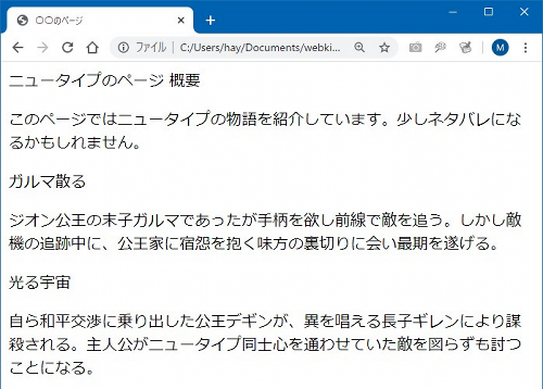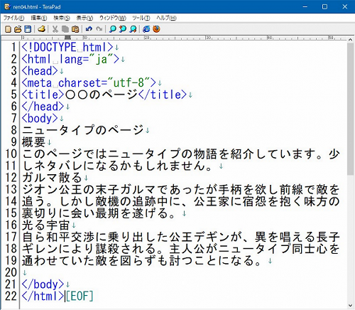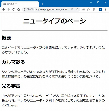 ![]() 見出しタグをつけた文字が大きくなり、文章構造によりメリハリがつきました。でも、文字を単に大きくするタグと思うことなかれ。見出しタグは実は超重要なタグなんです。なぜなら見出しタグは、検索エンジン対策(SEO)にも影響するからです。検索エンジンはウェブページの「見出しタグ」の情報を重視しているとされており、見出しタグにウェブページの内容を表す検索ワードを設定しておくことが、検索されやすいサイトを作るポイントと言われています。特に<h1>タグが重要らしいので、ウェブページを作成する際は、検索してもらいたいワードが<h1>タグに設定されるよう工夫すると良いでしょう。 なお、見出しタグについて詳しくは兄弟サイトウェブサイト作成入門・見出しタグに掲載しています。 <hr>タグと<center>タグ最後はまとめて区切り線の<hr>タグと、中央寄せの<center>タグを見ておきましょう。ここでは先に、表示結果を見てもらいます。![]() このイメージでは、一番上に表示された「ニュータイプのページ」が中央寄せになっており、その下に区切り線が引かれています。これらが、それぞれ中央寄せの<center>タグと、区切り線の<hr>タグの効果です。 まず、中央寄せの<center>タグ。これはブロックの中身を中央寄せにする「箱」のイメージです。この「箱」に入れると、真ん中に寄って来るんです。 そして、区切り線の<hr>タグ。区切り線なのでブロックらしくありません。終了タグもありませんのでそもそも中に入るものがない。「箱」というより「棒」みたいな感じです。でもページの構造をコントロールするのでブロック要素、と捉えましょう。ということで、まとめてやってみましょう。 SPONSORED LINK