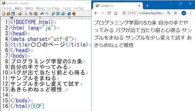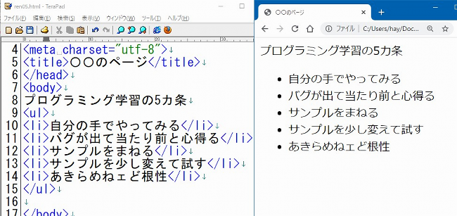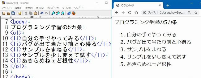番号が1~5番まで振ってありますが、これは自動でついています。このような箇条書きは、本とかレポートとかではよく見かけますが、ウェブページではそれほど見ないかもしれません。でも実はほとんどのウェブページが目立つところで使ってます。それは「メニュー」です。このページも上の方に、よくある横並びのメニューがありますが(このページだと「HTML基礎編」の「リスト」が選択されています)、これは元々リストになっているものを、スタイルシート(CSS)で先頭の番号を消したり横並びにしたりしてメニューにしています。なので世の中のほとんどのウェブページで実はリストを使ってます。 この他にも、何らかのワードとその説明をリストにするような場合もありますよね。これについても併せて確認します。いずれにせよ、リストも、情報に構造を与えるもの。なのでブロックレベル要素に含まれます。つまり、ブロックの「箱」のイメージ。雰囲気としては「中が仕切られた箱」という感じでしょうか。 というわけで、これも試していきますが、その前に作業ファイルを作りましょう。これまでもやってきたようにエクスプローラでwebkisoフォルダを開き、ひな型ファイルhina.htmlを[Ctrl]+[c]でコピー、[Ctrl]+[v]で貼り付けます。できた「hina - コピー.html」の名前を変えて「ren05.html」としましょう。練習ファイルの05番目です。ファイルができたら、テキストエディタとブラウザを起動し、それぞれに「ren05.html」をドラッグ&ドロップしましょう。「ひな型ファイルってなに?」という人は「準備編・ひな型ファイル」をご覧下さい。 準備が整ったら始めていきましょう。 SPONSORED LINK