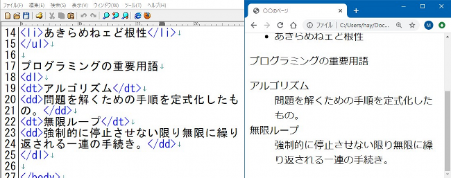 またリストタグは、入れ子にして階層的なリストを作れますし、属性を指定すると、リストの番号を「a、b、c・・」に変えたり、記号を■にしたりすることができます。番号や記号は、最近はスタイルシート(CSS)で指定するので、あまり属性を使うことはなくなりましたが、気になる人は、兄弟サイトウェブサイト作成入門・リストを見て下さい。 定義と説明のリストリストのもう一つは、定義や説明のための<dl>、<dt>、<dd>タグによるもの。それぞれ「definition list」(定義リスト)、「definition term」(定義する用語)、「definition descriptiont」(定義の説明)の頭文字から来ています。これも試した方が早いので早速やってみましょう。先ほど作ったリストの後に以下のテキストを挿入して下さい。ちょうど、リストの終了タグ</ul>の後で、</body>タグの前です。 追加したら[Ctrl]+[s]で保存。ブラウザ[F5]で確認しましょう。以下のような「用語」と「説明」ないし「定義」との関係のリストが表示されればOK。要は、<dl>~</dl>で全体のリストのボックスの箱を作り、その中に、<dt>~</dt>という「用語」を入れる箱と、その「説明」や「定義」を入れる<dd>~</dd>という箱を設置していく、というイメージです。わかりますか?HTMLと出力結果の対応関係をよく確かめて下さい。 ![]() できたら次へ進みましょう。 >>次のページへ進む
