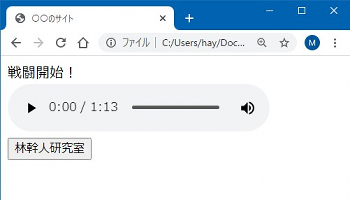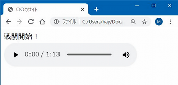 そこで作業ファイル「ren07.html」を作ります。もう慣れたものと思いますが、エクスプローラでwebkisoフォルダを開き、ひな型ファイル「hina.html」をコピペして、ファイル名を「ren07.html」に変更しましょう。できたら、テキストエディタとブラウザで開きます。ひな型ファイルについて確認したい場合は「準備編・ひな型ファイル」でどうぞ。 それではさっそく。テキストエディタで「ren07.html」を次のように編集して保存して下さい。 次に音声データを準備。「こちら」をマウス右ボタンでクリックし、メニューからリンク先を保存。ren07.htmlと同じ「webkisoフォルダ」に名前(taiko.mp3)を変えずに保存して下さい。エクスプローラーで「webkisoフォルダ」を見たときにren07.htmlとtaiko.mp3が同じフォルダにあることを確認しましょう。 2つとも作業が終わったらブラウザで表示します。以下のような表示でひとまずOK。再生ボタンを押すと音が鳴るはずです。うまくいかない場合は、ren07.htmlの内容をよく見直すことと、taiko.mp3とren07.htmlが両方ともwebkisoフォルダにあるか確認します。それでもダメならブラウザを変更してみましょう。最近のなら大丈夫だと思うけどブラウザによって対応してないのがあるらしい。どのブラウザでもダメならプログラムかファイルに原因があると思います。 SPONSORED LINK