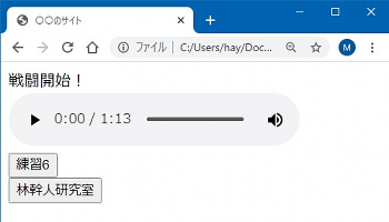 ![]() 保存してブラウザで表示すると以下のようになります。コメント(メモ)として入れた「audioタグのサンプル」「buttonタグのサンプル」という文字は表示されていませんし、元々表示されていた「練習6」のボタンがコメントアウトされて表示されなくなりました。改行<br>タグも無効化されていますね。よく使われますので覚えておきましょう。 ![]() コメントについては、一部のソースコードを無効化できる力を使って、デバッグ(プログラムの間違い探し)にもよく利用されます。プログラム全体で、どこに間違いがあるかわからない場合に、プログラムの後半半分をコメントアウトして実行して、うまくいかない場合は、プログラムの前半に間違いが含まれていることがわかります。さらに、前半の半分をコメントアウトして、うまくいったとしたら、今コメントアウトした中に間違いが含まれている可能性が高い、という具合です。 コメントやコメントアウトを使ったデバッグの方法については、兄弟サイト「ウェブ作成入門・コメントの使い方」「デバッグの方法」にも記載していますので参考にして下さい。 というわけで、ウェブデザインに必要なHTMLの基本については確認できたと思います。次からはついにスタイルシート(CSS)の基礎に進みます。楽しんでいきましょう。 >>次のページへ進む