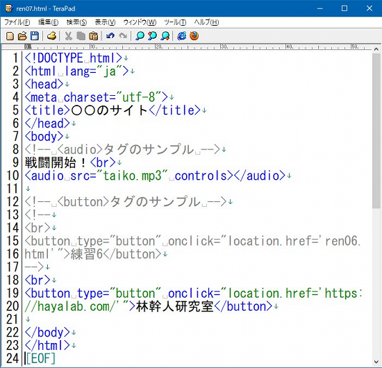 もう一つの「onclick属性」ですが、これはクリックしたときに何をするかを指定する属性です。そしてその値として「location.href='リンク先'」が指定されています。これはJavascriptのソースで「指定されたロケーション(場所)を参照せよ=リンク先にジャンプせよ」という意味です。「location.href='ren06.html'」の時は相対パスで、このファイルと同じフォルダにある「ren06.html」にジャンプせよ、という意味ですし、「location.href='https://hayalab.com/'」は絶対パスで「https://hayalab.com/'(林幹人研究室のサイト)」にジャンプせよ、という意味になります。 それから「リンク先」を囲んでいる「' '」はシングルコーテーション(厳密にはアポストロフィ)で、キーボードの真ん中の上の方、数字の7のキーを[Shift」を押しながら押すと入力できます。その外側のダブルコーテーション「" "」と入れ子になっているので気を付けて下さいね。ややこしいですが対応関係に注意して下さい。でも覚える必要もありません。必要になったらこのページに来るか、ググってコピペすればOKです。属性や設定値も他にもありますが、ここではこれだけで充分です。 というわけで編集できたら保存してブラウザで表示しましょう。以下のようなボタンが表示されたら半分完成。ボタンをクリックしてジャンプできたらカンペキです。 ![]() ボタンの実装は、実は「<input>タグ」でもできます。ただこちらはやはり「データ入力部品」なので、特に入力ないボタンは<button>タグで行きましょう。「<input>タグ」のようなデータ入力部品については、PHPとかJavascriptとか、データ入力を伴う処理を作るような場合にしっかり勉強すればよいと思います。データ入力部品についてもう少し知りたい人は兄弟サイト「ウェブ作成入門・入力フォーム」「データ入力部品」をご覧下さい。 コメントタグプログラム中にメモを書いておきたい場合や、一部のソースコードを無効化したい場合に使うのが「コメント」です。どんなプログラミング言語にもあります。当然HTMLにも。HTMLの場合、例えば、過去に書いたソースコード(プログラム)を読むと「なぜこう書いたんだっけ?」とわからなくなることがあります。あるいは、何十行、何百行とソースコードの行数が増えるにつれ、プログラムは複雑化し、そのソースコードの特定の部分が、「何のために書かれているのか」「何の処理をしているのか」がわかりにくくなってきます。なので、プログラムを書いているときに、プログラムの行間に、ちょっとメモを残しておきたいということはよくあります。そんな時に使うのが、コメントタグを用いたコメントです。 あるいは、HTMLの中で、例えば画像を表示していたり、表を表示していたりしたときに、それらを一時的に表示しないようにしたい場合があります。でも削除してしまうと、また戻すときにプログラムを書き直す必要がありますので、一時的に無効化しておきたい、という場合にも、コメントタグが使えます。このようにコメント機能によってプログラムの一部を無効化することを「コメントアウト」と言います。書き方は以下の通りです。 <!-- この間はブラウザには表示されません --> <!-- 改行されていても 同じく表示されません。 --> つまり「<!--」から「-->」までの間にコメントを記載します。途中で改行が入ってもコメントとして処理され、コメントの内容は、ブラウザには表示されません。つまり、HTMLの中で「<!--」が出てくると、次に「-->」が出てくるまでの部分は非表示になります。テキストエディタで「ren07.html」を次のように編集しましょう。追加したのは、以下イメージの8行目と12行目のメモ。そして13行目の「<!--」と17行目の「-->」です。 SPONSORED LINK