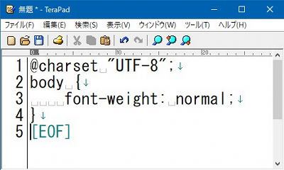 テンプレCSSの作り方まずはTerapadを起動します。このサイトではテキストエディタとしてTerapadを使って説明していますが、ここに直接飛んできた人で、特に初心者の人は「開発環境準備編・テキストエディタ」「Terapadの設定」を確認して下さい。Macの人とか「他のエディタを使う!」という人は自分で調べて下さい。というわけでTerapadで説明していきますが、Terapadを起動したら、以下のテキストエリアの4行すべてを選んで[Ctrl]+[c](コピー)して、開いたTerapadに[Ctrl]+[v]で貼り付けて下さい。テキストエリア内でワンクリックした後で[Ctrl]+[a]を押すとテキストエリア内の文字が反転表示の選択状態になります。 Terapadへの貼り付けがうまくいくと、以下のようになります。 ![]() 意味を説明すると、1行目の「@charset "UTF-8";」は「この(CSS)ファイルは文字コードがUTF-8(unicode)ですよ」という宣言です。作っているウェブページの実際の文字コードが「UTF-8」ならこのように書きます。他の文字コードで作られているならその文字コードを書きます。このサイトでは一貫してunicodeで説明してきていますが、最近のウェブの世界もunicode推奨なので「UTF-8」でOKでしょう。実際に作った文字コードと宣言が違うと文字化けするので注意して下さい。あるいは、文字化けしたら、実際の文字コードとCSS文書やHTML文書内に書かれた「宣言」との違いをよく確かめましょう。 そしてその下に続く内容は「body { font-weight: normal; }」となっています。実際は改行されたりスペースが入力されたりしていますが、内容としてはコレです。意味は「bodyタグに対してfont-weight(文字の太さ)をnormal(普通)にせよ」ということになります。bodyタグはHTML文書の基本タグに含まれる「ウェブページの本文」を示すタグでした。つまりこのCSSは「ウェブページの本文の文字を普通にせよ」という意味。「普通」なのでこれを指定しても変化はありません。作ろうとしているCSSファイルは、テンプレCSSなので、とりあえず効果のないスタイルを書いておいた、というわけです。 SPONSORED LINK