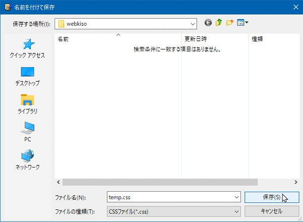 次にこれをUnicodeで保存します。テンプレCSSファイルですので、ここでUnicodeで保存しておけば、後からコピーして使う際に便利です。 そこでTeraPadのメニューバーの「ファイル」から「文字/改行コード指定保存」を選択。すると小さいウインドウが表示されますので「文字コード」を「UTF-8N」として「OK」ボタンを押します。以下のイメージです。 ![]() ![]() すると「名前を付けて保存」画面が表示されますので、既に作成してある作業フォルダ「webkiso」の中に「temp.css」としてファイルを保存しましょう。「webkisoフォルダ?」と思った人は、「開発環境準備編・作業フォルダ」を見て作成しましょう。 ![]() あと「逆立ちしてもできない!」という人。テンプレCSSファイル「temp.css」のサンプルを「こちら」に置いておきますので必要な人はどうぞ。マウスの「右ボタン」でクリックし「名前を付けて保存」のようなメニューを選び、webkisoフォルダにダウンロードしておくとよいでしょう。 SPONSORED LINK