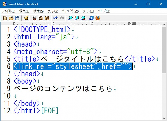 ひな型HTMLファイルの修正もう一つ。ひな型HTMLファイルを修正しておきましょう。CSSファイルを読み込む設定をしておきます。「webkiso」フォルダを開いて、ひな型ファイル「hina.html」をワンクリックして選択。[Ctrl]+[c]→[Ctrl]+[v]でコピペします。できた「hina - コピー.html」のようなファイルの名前を変えて「hina2.html」として下さい。ひな型ファイルがない人、「開発環境準備編・ひな型ファイル」に戻って「hina.html」を作成してから以下の作業を行って下さい。hina2.htmlができたら、Terapadで開きます。基本タグだけが書かれているはずですが、その中のヘッダ<head>~</head>タグの間で、ちょうど<title>~</title>タグの後に、以下のタグを追加して下さい。 全体のイメージとしては以下のようになります。追加部分を反転表示しています。 ![]() 追加したタグは「<link rel="stylesheet" href="">」の一行。意味としては「スタイルシートのファイル~を読み込んでね」ということです。これはひな形ファイルで、読み込むCSSファイルの名前はまだわかりませんので「""」(ダブルコーテーション2つ)つまり「ファイル名未入力」となっています。読み込むCSSファイルが例えば「style.css」だったら「<link rel="stylesheet" href="style.css">」となるわけです。 間違いなく追加できたら、[Ctrl]+[s]で保存しておきましょう。 これで準備が整いました。次こそはCSSのコーディングを行います。 >>次のページへ進む