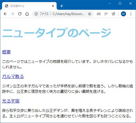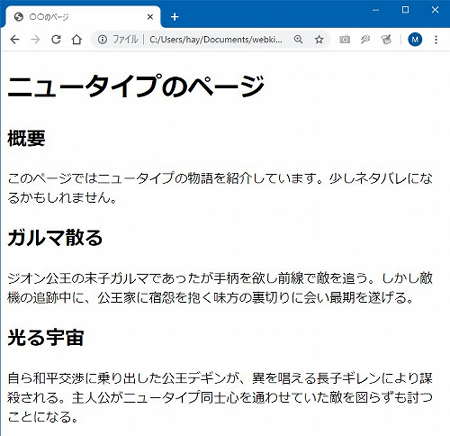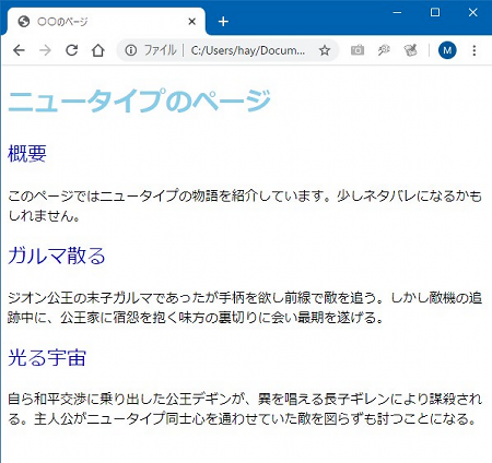 文字の大きさ文字の大きさは「font-sizeプロパティ」を使います。「ren11.css」に「font-sizeプロパティ」を追加してみましょう。以下の4行目と9行目(下から2行目)です。テキストエディタに入力したイメージもつけておきます。ren11.css ![]() 説明します。ここでは、font-sizeプロパティの2つの行を追加しました。一つは「font-size: 48px;」、もう一つは「font-size: 1.2rem;」です。文字の大きさの設定なのでだいたいわかると思いますが、一つ目「48px」というのは「48ピクセル」と読みます。ピクセルとは画素のこと。デジカメとかスマホのカメラで「メガピクセル」とか「何百万画素」とか聞いたことあると思います。デジタルの映像は動画も写真も文字もすべて、色のついた小さな点・・あるいはツブが寄り集まってできていますが、その点やツブのことをピクセルと言います。48ピクセルとはその点やツブが48個並んでいる長さ、ということです。 一般に、ブラウザで表示したときに見やすいサイズというのがありまして、だいたい14~18pxぐらいがよいらしい。実際、多くのウェブサイトがこの文字サイズ。なので48pxはかなりデカい文字になります。 一方で、もう一つの方は「font-size: 1.2rem;」となっています。「rem」って何でしょうか。これは「標準サイズを基準にして何倍か」を指定する単位になっています。なので「1.2rem」とは、見ているブラウザで「特に何も指定していない普通の大きさの文字」を基準に「1.2倍」ということです。「root em」の略らしいのですが、忘れてよいでしょう(おいおい)。ここでは中見出しの「概要」とか「ガルマ」とか、見出し以外の文字の1.2倍にしていますが、微妙な違いかも。違いを出したいなら「1.5rem」(1.5倍)とか「2rem」(2倍)とかに変えて試すと効果がハッキリわかります。 よく確かめて間違いなく入力できたら、上書き保存して、ブラウザを更新しましょう。以下のイメージのようにできたらOKです。できない場合はよく見直しましょうね。 ![]() 文字の下線文字の下線を引くには「text-decorationプロパティ」を使います。「テキスト・デコレーション」です。下線だけじゃなく上線や取り消し線も引けます。逆にこのような線を消すのもこのプロパティです。というわけで「ren11.css」を編集して試しましょう。以下の5行目の「text-decoration: underline;」です。 ren11.css(修正箇所のみ) 編集したら保存してブラウザを更新しましょう。中見出しのところに下線がつけばOKです。 ![]() 「text-decorationプロパティ」は他にも次のような値をとります。中でも「none」はすでに引かれた線を消すために使われます。例えば、リンクの<a>タグを設定すると「リンクはこちら」(これは実際はリンクではありません)のように下線が勝手に引かれますが、これを取り除くには「text-decoration: none;」と設定します。必要に応じて効果的なスタイルを指定しましょう。