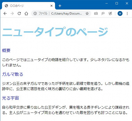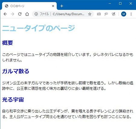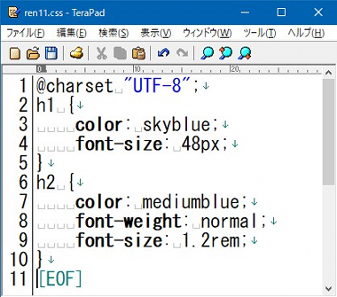文字の色まずはわかりやすい文字色の設定から見ていきましょう。最初ですのでこれまでのサンプルでも何度か登場してきた「colorプロパティ」から始めます。テキストエディタで「ren11.css」を次のように編集しましょう。中括弧「{ }」の向きや対応関係に気を付けて下さいね。中括弧は「h1 { color: skyblue; }」となっているものを改行を入れて見やすく入力したのが以下のサンプルです。まだ見やすい実感がわかないと思いますが、設定項目が増えてくると、この書き方の方が見やすいことがわかってきます。 ren11.css ここでCSSで設定している色は、スカイブルー、ミディアムブルーの青系2色。つづりを間違えないように。それから配色は同系でまとめると無難にまとまります。いろんな色を入れてまとめるのは上級者向け(たぶん)。それから色の名前や種類については兄弟サイト「ウェブ色見本」をご利用下さい。 簡単に説明すると、1行目はひな形CSSファイルに記載された「文字コードはUTF-8ですよ」という宣言でしたね。2行目からCSSの設定ということになりますが「h1 { color: skyblue; }」というのは「<h1>タグに対して文字色をスカイブルーにせよ」という意味になります。同様に「h2 { color: mediumblue; }」は「<h2>タグに対して文字色をミディアムブルーにせよ」と設定しているわけです。わかりますよね。 できたら[Ctrl]+[s]で上書き保存して「ren11.html」を開いたブラウザを[F5]キーで更新します。このCSSがうまく読み込まれれば、以下のようになるはずです。ならない場合はソースコードをよく確かめましょう。HTMLファイル「ren11.html」のヘッダー部分に設定された<link>タグのhref属性にCSSファイル「ren11.css」が正しく設定されているかよく見て下さい。あるいは、CSSの入力で全角スペースや全角文字、全角記号を使っていませんか?半角ですよ。よーく確認しましょう。 ![]() SPONSORED LINK