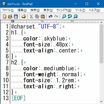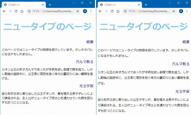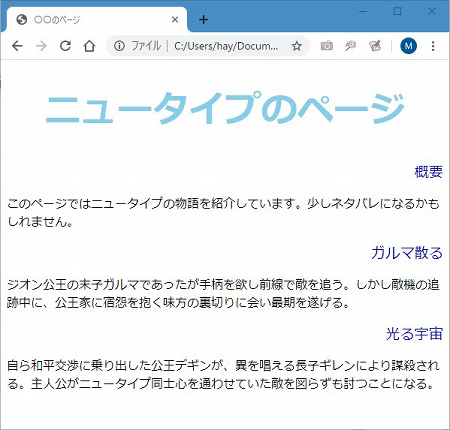 それでは、テキストエディタで「ren11.css」を次のように編集しましょう。このページでは最初なので下にテキスト全文も貼っておきます。前のページで作ったところから追加したのは、下のイメージの5行目と11行目ですね。「text-align」の「-」はハイフンです。あと前ページの最後でやった「text-decorationプロパティ」も削除したのでこのサンプルにはありません。 ![]() できたらテキストエディタで[Ctrl]+[s]で上書き保存。ブラウザを[F5]キーで更新しましょう。成功すれば以下のようになります。大見出しの<h1>タグを指定した「ニュータイプのページ」が中央寄せになり、中見出しの<h2>タグを設定したところが右寄せになっていることを確認して下さい。うまくいかない場合はよくチェックして下さい。記号もスペースも半角です。 SPONSORED LINK