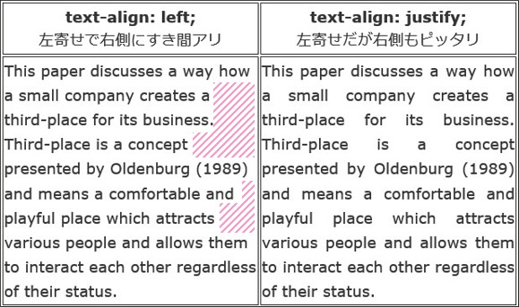 ![]() text-alignプロパティの書き方はだいたい予想できると思いますが、「text-align: center;」で中央寄せ、「text-align: right;」で右寄せになっています。以下の値を設定できます。