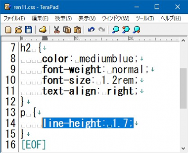 行間のスタイルは「line-heightプロパティ」を使います。「ラインハイト」プロパティです。また読まない「g」が含まれてますが気にせず。さっそくサンプルを見てみましょう。 ![]() 追加したのは上イメージの13行目から15行目。line-heightプロパティのところだけ反転表示しています。改行しないで書くと「p { line-height:1.7; }」となります。セレクタに「p」としていますので<p>タグつまりは段落のタグのスタイル設定です。意味は「段落<p>タグに対して行間を1.7倍にせよ」ということになります。追加した3行だけ以下に貼っておきます。 line-heightプロパティの設定値には単位がついていませんが、これは「文字の1.7倍」という意味。単位がついてない数値は「文字サイズからの倍率」です。他にも次の値を設定できます。