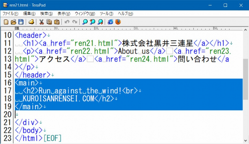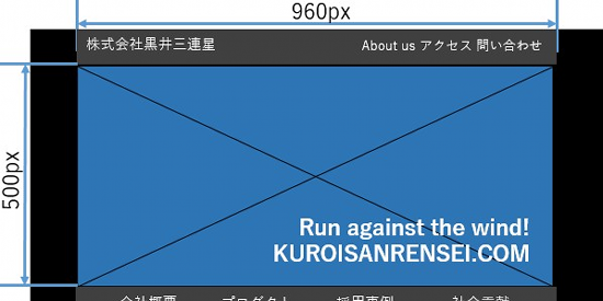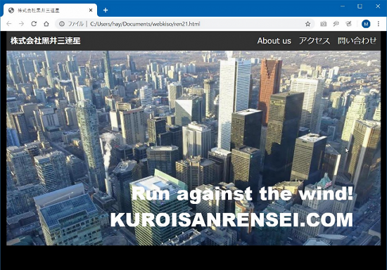 それからもう一つ。上のサンプルの最後のところ。<a>タグのスタイル設定がありました。コメント部分(/*~*/)を除いて改行しないで書くと「header a { color: white; }」と「header a:hover { color: red; }」となっています。このセレクタの書き方、覚えてますか?設定対象を半角スペース区切りで指定すると、入れ子になったタグの外側のタグの中にある内側のタグ、という指定ができるわけです(文字で書くとややこしいですが)。 つまり「header a { ~ }」は「<header>タグの中にある<a>タグのスタイルを設定せよ」という意味。「header a:hover { ~ }」は「<header>タグの中にある<a>タグでマウスオーバーした時のスタイルを設定せよ」という意味です。設定内容はコメントの通りで、何もなければリンクは白色の文字。マウスオーバーで文字が赤色になります。セレクタの書き方は、「CSS編・基本の書き方」で思い出しましょう。 というわけで、テキストエディタで保存して、ブラウザを更新してみて下さい。うまくいけば以下のようになるはず。リンクにマウスオーバーして、文字が赤色に変化したらパーフェクトです。 ![]() 横並びができましたね。横並びになった様子を図解しておくと、以下のようにボックスが動いた結果です。 ![]() かなり実践的になって難しい感じがするかもしれませんが、パターンを覚えるだけですので大丈夫。同じパターンは、次のページでナビゲーション(メニュー)の作り方を確認するときに出てきます。 メインビジュアルファーストビューで最重要な要素がもう一つ。「メインビジュアル」です。通常、印象的な画像を背景にドーンと設定して、キャッチなコピーを示して、ということが多いですよね。ウェブサイトの第一印象を左右する部分です。というわけで作っていきましょう。まずは「ren21.html」を次のように編集します。反転表示部分が追加したところです。下にテキストも貼っておきますが、追加する場所を間違えないよう注意して下さい。 ![]() ren21.html(追加分のみ) 説明します。まず<main>タグ。これはこのページの前の前の「デザイン編・デザインのタグ」で出てきました。<main>タグは「主要なコンテンツ」というような意味のタグ。メインビジュアルの「メイン」とは関係ありませんので誤解なきよう。HTML文書を整理するタグ、という意味では<section>タグでもいいと思いますし、<div>タグにIDを設定して「<div id="mainvisual">」としてももちろんいいでしょう。ここで<main>タグを使っているのはその程度の理由です。 そしてその中に中見出しの<h2>タグで「Run against the wind!(改行)KUROISANRENSEI.COM」という文字列が指定されています。検索キーワードとして「株式会社黒井三連星」という社名ほど重要じゃないけど、次に重要なワード、という意味で<h2>タグを使っています。「Run against the wind!」(風に向かって走れ)は、この会社のキャッチコピーのイメージです。 この時点で、保存してブラウザで表示を確かめましょう。次のようになるはずです。 ![]() メインビジュアルとしてはもちろんこれではダメです。背景画像を設定して、サイズを整え、文字の表示も調整しましょう。そこでまずは、背景画像を準備します。次の画像をマウスの右ボタンでクリックして表示されるメニューから名前を付けて保存。ファイル名はそのまま「main01.jpg」とします。そして「webkisoフォルダの中のgazoフォルダ」にこの画像ファイルを格納して下さい。