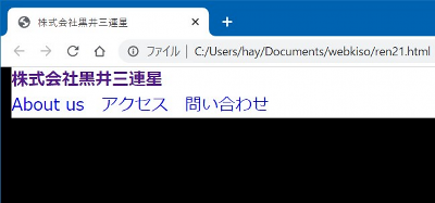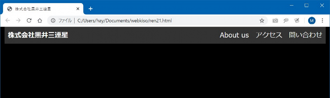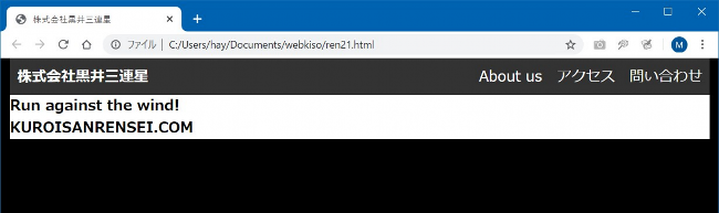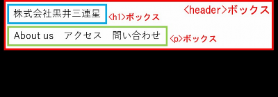 というわけで涙を拭いて。ファーストビュー。早速確認しましょう。作業ファイルは前のページで作った「ren21.html」と「ren21.css」をそのまま使います。ない人は、前ページからやり直して下さい。そこに加筆編集していきます。ここでの目標は、ファーストビューということで、デザインカンプのヘッダー部分とメインビジュアルの実装ということにしましょう。 ![]() ヘッダー部分まずはウェブページの一番上のヘッダー部分を作ります。デザインカンプの通り、一番上に濃いグレーの領域があり、左側に「株式会社黒井三連星」、右側に「About us」「アクセス」「問い合わせ」のリンクがある形です。簡単に作るなら「株式会社黒井三連星」の後、全角スペースを10数個入力して、その後に「About us」「アクセス」「問い合わせ」と入力すればできます。でもこのやり方。あまり好ましくありません。例えば、文字サイズを変更するとデザインがズレます。大きくすれば全角スペースも大きくなるので、1行に収まらなくなった文字が2行目に行ってしまいます。あるいは、文字サイズを小さくすると左寄せの場合は左側に詰まって、右端に意味のないスペースができます。「株式会社黒井三連星」は左側に、「About us」「アクセス」「問い合わせ」はセットで右側にしたいところ。 もう一つは、これらの左と右は役割が違うことです。「株式会社黒井三連星」は、いわゆるID領域で、このサンプルでは会社名ですが、ウェブサイトを識別する文字列やロゴなどが入ります。一方の右側は、全体を説明するような情報がよく設定される箇所。「About us」は「私たちについて」ということでサイトの運営主体についての情報ですし、「アクセス」は運営主体の所在地やそこへの行き方、「問い合わせ」は運営主体の連絡先情報です。左端のID部分とはウェブページ内での意味が違いますので、使うタグも変わってきます。 というわけで、いずれもページの一番上にあるヘッダー部分だけど、左側はID領域、右側は運営主体に関わる情報へのリンクの領域、ということで「ren21.html」を次のように編集します。 ren21.html 編集箇所は、<title>タグと本文内の<header>~</header>タグのところです。よく見て下さいね。<title>タグはOKとして、<header>~</header>タグは、<div>~</div>タグの中に入れ子になっています。 ところで<header>~</header>タグ。デザインのタグということで、このページの前の前の「デザイン編・デザインのタグ」でやりました。タグ自体に効果はなく、<header>~</header>の間にはページのヘッダー部分が入ってますよ、ということを表すために用いられます。 そしてその中に、大きく2つのブロック要素、大見出しの<h1>~</h1>タグと、段落の<p>~</p>タグが設定されています。 <h1>タグは、大見出しで、このページの検索キーワードとなるような文字列を設定するために使います。このことはSEO(検索エンジン対策)上、きわめて重要。というわけでこのサンプルでは、まさにID領域ということで、このサイトの運営主体である(ことが想定される)「株式会社黒井三連星」が設定されています。そしてこの会社名は<a>タグを使って「ren21.html」つまりこのページ自体にリンクされています。つまり、会社名をクリックすると、この会社のウェブサイトのページが再表示されることになっており、このページがトップページであることを示す形になっています。 もう一つのブロック要素は<p>タグです。これは段落のタグですが、特にSEO上も重要ではない文字列をまとめるために使っています。どこかのサイトにアクセスするために「About us」「アクセス」「問い合わせ」みたいなキーワードで検索することって普通ないですよね。そして、それぞれが<a>タグで3つのHTMLファイルにリンクされるよう指定されています。つまりは、「About us」「アクセス」「問い合わせ」の詳細ページへのリンクを想定しています。(実際には詳細ページは作ってないのでクリックしてもページなしのエラーになるだけです) というわけで、このHTML文の構造は、<header>~</header>タグの中に、<h1>~</h1>タグと、<p>~</p>タグが設定され、それぞれの中に<a>タグでリンクが設定されている、という作りになっています。 編集したら保存してブラウザで表示を更新しましょう。次のようになるはずです。 ![]() どうなっているかわかりますか?図解すると3つのボックスが、以下のイメージのように入れ子になっています。外側がheaderボックスで、中がh1ボックスとpボックスです(もちろん一番外にはdivコンテナボックスがあるけど省略)。h1ボックスとpボックスは、いずれもブロック要素ですので、縦に積み重なる形になります。 ![]() SPONSORED LINK