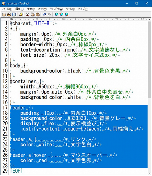 ブロック要素の横並びブロック要素は縦に積み重なりますが、ここでは本当は横並びにしたいわけです。そこでCSSの出番です。「ren21.css」を次のように編集します。もちろん「ren21.css」の内容は前ページの続きです。追加した反転表示の箇所についてはテキストも貼っておきます。![]() ren21.css(追加分のみ) 説明します。まずは<header>タグに対する設定です。上のサンプルのコメントにもある通り、「padding」でheaderボックスの内余白を上下左右10pxにしています。つまりheaderボックスの枠とその中に入る要素の間の余白、ということです。そして背景色を「#333333」の濃いめのグレーに指定しています。ここまでは「横並び」とは関係ありません。 関係あるのはその次の「displayプロパティ」。これはボックスの種類を指定するものです。HTMLの要素には、インライン要素とブロック要素がありますが、displayプロパティを使うと、インライン要素を幅と高さのあるブロック要素に変更したり、ブロック要素を文字や画像と同じインライン要素に変更することができます。あと、インライン要素を「表のセル」のように変更することもよくあります。頻繁に使われるものだけ紹介しておきます。