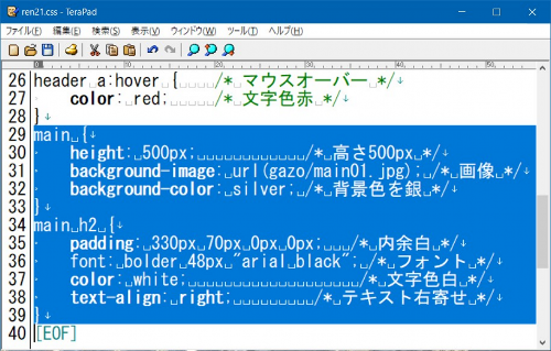 main01.jpgの準備ができたら「ren21.css」を編集します。以下イメージの反転表示部分が追加分です。テキストも貼っておきます。CSSファイルの一番下に追加すればOKです。 ![]() ren21.css(追加分のみ) 説明します。まず「main {~}」の設定。コメントにある通りですが「heightプロパティ」で高さを500pxに設定しています。前にも書きましたが、ファーストビューはだいたい600pxぐらいの高さになるので、ヘッダー部分と合わせて500pxぐらいかな、という見積もりに基づいています。 次に「background-imageプロパティ」で背景画像を設定しています。先ほどダウンロードしてgazoフォルダに格納したmain01.jpgを指定しています。 そして「background-color」で「silver」(銀色=明るめの灰色)を設定しています。背景画像を設定しているので必要なさそうですが、利用者によってはデータ通信量を減らすなどの目的でブラウザの画像表示を止めているケースがあるために設定しています。あとの設定で文字色を白色にしていますが、何もないと「白地に白文字」で何も見えなくなってしまいます。 次に「main h2 {~}」の設定。この書き方。このページの上の方でも出てきました。mainボックスの中の<h2>タグの設定という意味でしたね。逆に言えばmainボックスの中の<h2>タグ以外の<h2>タグはこの設定の対象外、ということになります。 これもコメントに書いてある通り。内余白を設定し、フォントを太文字、サイズ48px、種類を「arial black」にし、文字色を白色にし、テキストを右寄せにしています。ちなみにフォントの種類は、兄弟サイト「フォント見本」にまとまっています。 ここで少し説明が必要なのは、内余白「padding」の設定。上側の内余白が「330px」とかなり大きくとられています。これは文字を下の方に表示するためです。右側の内余白も「70px」となっていますが、ここでの表示が「text-align: right;」で右寄せになっているため、右余白をちょうどよさそうなところで設定しているわけです。これらの設定に正解はなくて、上の方に表示したり、中央に表示したりしてもよいでしょう。 ボックス内での別のボックスの表示位置を指定する方法としては「positionプロパティ」を使うことがよく行われます。ピンポイントでビシっと表示位置を指定できます。ですがここでは、できるだけすでに知っていることで実現したい、ということで「padding」で表示位置を調整しました。「positionプロパティ」について知りたい場合は、「ウェブサイト作成入門・positionによるボックスの配置」を確認しましょう。 編集が終わったら保存してブラウザで結果を確認しましょう。以下のようになればOK。ならなければよく見直して完成させましょう。 ![]() ところで、このサイトは、ChromeかFirefoxのブラウザを前提としていますが、IEを使っている人。メインビジュアルの画像が表示されないことがあります。どうやら、IEは<main>タグをブロック要素ではなくインライン要素として認識しているらしく背景画像が設定できないみたい。そんな場合は、CSSの「main」の設定に「display:block;」を追加します。「main {~}」の「{ }」の中ですよ。これで<main>タグがブロック要素に代わり画像が表示されます。トラブったら試して下さい。 というわけでウェブページの形が見えてきました。次に、やはりなくてはならないナビゲーション(メニュー)について、作り方を確認します。 >>次のページへ進む