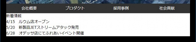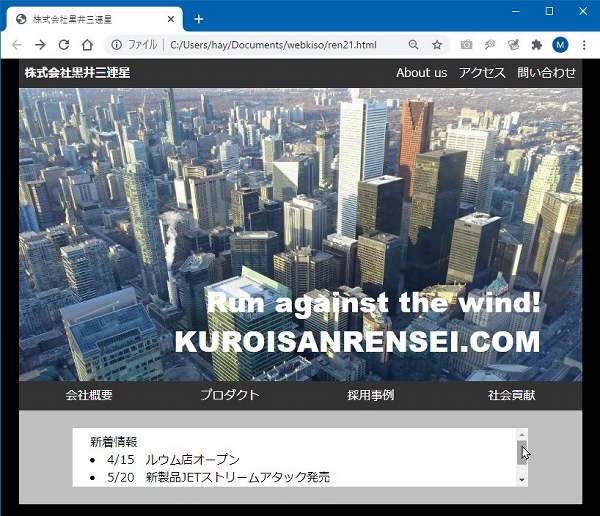 というわけで、編集が完了したら保存してブラウザで確かめましょう。以下のようになればOKです。特に新着情報のところ。以下のイメージでは2件表示になってますが、3件の情報があります。スクロールさせて確かめてみて下さい。 ![]() かなりできてきましたね。ウェブページらしくなってきて完成形が見えてきた気がします。続いてコンテンツ部分とフッターをまとめて確認しましょう。 >>次のページへ進む