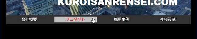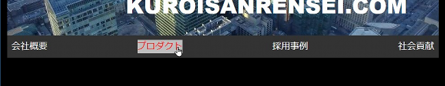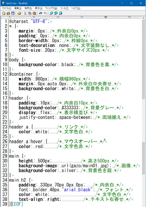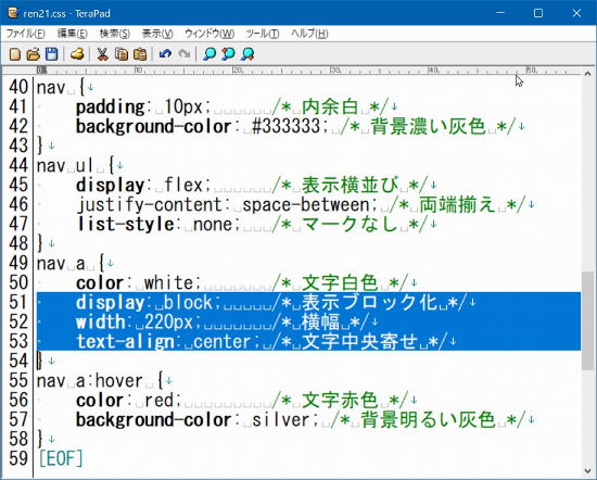 そこで「ren21.css」を次のように編集します。ファイルの最後に追加します。 ren21.css(追加分のみ) 順に説明していきましょう。まず、navボックスに対して、内余白10pxと背景色を濃い灰色に設定しています。内余白の指定は大丈夫ですよね。一つだけ指定した場合は、それが上下左右の内余白になります。 次に「nav ul」に対する指定です。これはnavボックスの中にある<ul>タグに対する指定、という意味です。設定内容はというと、また出ましたブロック要素の横並び。「display: flex;」の指定です。これは前ページ「デザイン編・ファーストビュー」のヘッダー部分の指定のところでやりました。これを指定したボックスの中にあるブロック要素を横並びにする、という設定でした。「フレックスボックス」というんでしたね。ここでは「nav ul」に指定しているので、その中にある<li>ボックスが横並びになります。 そしてこれとセットで設定されるのが「justify-contentプロパティ」でしたね。並び方を右寄せにしたり、中央に寄せたり、両端均等にしたりできました。これも忘れた人は前ページで確認して下さい。そしてここでは「justify-content: space-between;」が設定されていますので、両端揃えになります。 さらに「list-style: none;」ということで、番号なしリストの「・」マークを付けない設定がなされています。 続いて「nav a」と「nav a:hover」に対する設定です。これも「nav ul」と同じで、navボックスの中にある<a>タグと、<a>タグのマウスオーバー時のスタイルを指定するものです。何もしない状態で白文字。マウスオーバーすると赤文字で、背景がシルバーということで明るい灰色となります。 編集できたら保存して、ブラウザを更新します。うまくいけば以下のようになります。いかない場合はよく見直しましょう。 ![]() 幅と高さのある面をリンクさせるほぼできたように見えますが、実は細かいところができていません。それはリンクが文字だけになっている点。「会社概要」とか「プロダクト」とか、文字の上にマウスカーソルを移動すると変化し、クリックしてジャンプするのも文字だけです。文字から少し外れるとクリックできませんよね。「それでもいいじゃん!」という人もいるかもしれません。確かにその通り。いいと思えばそれでもいいです。ですが世の中のこの手のナビゲーション。文字以外のところもクリックできます。つまりは、ボックスごとボタンのようになっています。確かに、メニューの要素の文字が少ない場合、クリックできる箇所は小さくなります。それからこのサンプルでもそうですが、メニューの選択肢が少ないと、個々のメニューの間にクリックできない大きなすき間ができています。使いやすさからいうと、あまり良いとは言えません。 というわけで、ナビゲーションのリンクを、文字だけじゃなく、幅と高さのある文字の周囲の面としてクリックできるようにしましょう。 そこでまた「ren21.css」を編集します。途中に追加しますので間違えないように注意して下さい。反転表示の3行です。見えにくいですが終わりの「}」に特に気を付けましょう。ここで追加されたものは「nav a」に対する設定、ということになります。追加分のテキストも貼っておきます。 ![]() ren21.css(追加分のみ) 説明します。まず「display: block;」。また「displayプロパティ」が出てきました。これまでは、ブロックレベル要素を横並びにする「フレックスボックス」を作るために使ってきましたが、ブロック要素をインライン要素にしたり、インライン要素を表のセルのようにしたりすることもできました。詳しくは前ページ「デザイン編・ファーストビュー」で確認して下さい。そしてここでの「display: block;」は、これを設定している「nav a」に対して、インライン要素をブロック要素に変更する、という意味になります。つまり<a>タグは、そもそもインライン要素で、文字や画像などの内容物のサイズを超えた幅や高さを持たないわけですが、ブロック要素化することで幅や高さを持てるようにした、ということです。 結果として設定できるようになった「widthプロパティ」が次の行に書かれています。横幅を220pxとしていますが、全体の「divコンテナボックス」の幅が960pxなので、それを4つのメニューで分けると、220pxなら十分収まる、というサイズです。 そして「text-align: center;」は簡単。文字を中央に寄せる、という設定になります。 完成したら保存して、ブラウザを更新しましょう。 ![]() できましたか?マウスカーソルをメニューに近づけると、ボックスとしてリンクが反応すると思います。文字から離れた場所をクリックしても、設定されたページにジャンプします(もちろん、ここではエラーになりますが)。うまくいかない人は、よく確かめて下さい。 ナビゲーションの作り方は、他にもいろいろありますが、この方法なら比較的簡単にメニューを実現できると思います。フレックスボックスが、古いブラウザに対