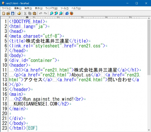 ナビゲーションの作り方を確認するために、また作業ファイルを準備しましょう。このサイトで勉強している人は、前ページまでに使ってきた「ren21.html」と「ren21.css」を使います。このページに飛んできた人は、前の前のページ「デザイン編・大枠を作る」に戻ってファイルを用意して下さい。 というわけで準備ができたら、「ren21.html」と「ren21.css」をテキストエディタで開きます。これまでこのサイトの説明通りに作ってきているとすると、それぞれの内容は以下のようになっているはずです。 ![]() ![]() ・・・長いですね。次からは全文出せなさそうなので、しっかりとついてきて下さいね。 そして今回作るナビゲーションは、デザインカンプの次の部分です。 ![]() SPONSORED LINK
