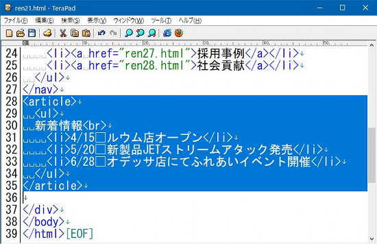 スクロール領域ナビゲーションと言えばメニューですが、ついでにもう一つ。デザインカンプの新着情報も作っておきましょう。新着情報も「新しい情報があったので見てね」というような意味合いがあって、ナビゲートしている情報といえなくもないかな、ということで。ちょっと強引ですが。デザインカンプの新着情報は、デザインカンプとしては情報不足で、もう少し情報が増えた場合にどうするのか、という対策が抜けています。新着情報が多い場合、新着情報欄が大きくなってしまい、デザインが崩れそう。というわけで、情報が増えてもスクロールさせられる形式にしましょう。 スクロールの方法はCSSで確認するとして、まずは「ren21.html」を追加編集します。追加する場所は、上で追加した<nav>~</nav>タグのあと。以下のように編集しましょう。反転表示のところが追加した部分です。下にテキストも貼りつけておきます。 ![]() ren21.html(追加分のみ) 解説しましょう。最初にくるのが<article>タグです。これも「デザイン編・デザインのタグ」で見たタグです。HTML文の中で「記事(artcle)の領域ですよ」と分かりやすくするために使われます。 次がまた出ました<ul>タグ。番号なしリストのタグですね。そしてリストの要素として<li>タグが使われています。大丈夫ですよね? そしてHTMLを編集できたら保存して、ブラウザを更新して結果を確かめましょう。まだスタイル適用していないので、以下のような形で表示されるはずです。 これをCSSでスタイルを指定しましょう。やりたいのは、ここで使用した「articleボックス」を明るい灰色にすること、リストの「ulボックス」の背景を白色にし、縦方向のスクロールバーを付けることです。 ![]() SPONSORED LINK