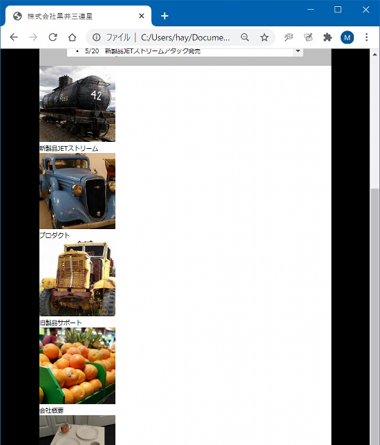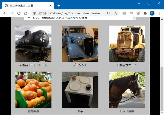 タイル型のコンテンツデザインカンプでは一辺250pxの正方形の写真が6枚貼られているだけです。ただ、企業のウェブサイトを想定していますし、インスタの一覧ページのように写真だけ、というのはあまりないかもしれません。そこで、写真と説明をセットにしてボックスを作り、それを3つずつ均等に配置する、ということをしたいと思います。「3つずつ均等に配置」するのはCSSでやりますので、まずはHTMLで「画像+説明」のボックスを6つ作りましょう。というわけで早速。「ren21.html」を以下のように編集して下さい。以下追加分だけですが、追加する場所を間違えないように。前にやった続きで言うとarticleボックスの終了タグ</article>の後で、divコンテナボックスの終了タグ</div>タグの前です。一応、編集する場所のイメージも貼っておきます。 ren21.html(追加分のみ) ![]() 説明します。まず<section>タグが登場。これは「デザイン編・デザインのタグ」で見たやつです。HTML文書を構造化してわかりやすくするタグでした。<section>タグは、特に意味があるわけではなく、他の部分と違うセクションですよと言っているだけです。<section>タグが複数出てくる場合はid名やclass名をつけて区別します。今回作っているページでは<section>タグは1度しか出てきませんので、id名やclass名はありません。 続いて<div>タグです。よく見ると<section>~</section>の中に6つの<div>~</div>が入っているのわかりますか?つまりは、sectionボックスの中に、6つのdivボックスがあるわけです。同じ書き方のパターンが繰り返されているのが分かると思います。 そしてそれぞれのdivボックスに、<img>タグと説明ワードが設定されています。内容はわかりますよね?各<img>タグには、src属性で「gazo」フォルダに保存されたt1.jpg~t6.jpgまでの6つの画像ファイルが指定されています。全部同じ書き方です。 編集が終わったら保存してブラウザで表示を確認します。以下のようになれば想定通り。ならない場合はよく見直しましょう。 ![]() sectionボックスの中にある6つのdivボックスが縦並びになっていますが理由はわかりますよね?ブロックレベル要素は縦に積み重なるんでした。また、divボックスの中にある画像ファイルと説明ワードが改行されて表示されていますので、結果的に「画像→文字→画像→文字・・」と縦に繰り返す形になっています。HTMLとの対応を確認して下さい。 SPONSORED LINK