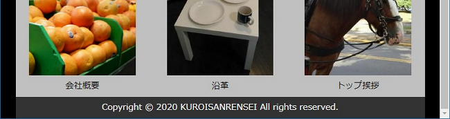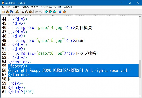 フッターを作るいよいよ最後になりました。フッターです。フッターにもいろいろあって、フッターメニューを作ったり、サイト内の全ページのサイトマップを掲載したり、上の方が情報量少な目でスッキリしているのに、最後の最後でメタボってるページもあります。ここではデザインカンプの通り、コピーライト標記だけの超スッキリフッターを作りましょう。スッキリフッターなら話は簡単。HTMLでフッターの領域を作って表示させる内容を記載しておき、CSSで見た目を整えれば「できあがり」です。というわけで、サクッと終わらせましょう。「ren21.html」を次のように編集します。追加は反転表示の箇所です。 ![]() ren21.html(追加分のみ) スッキリ過ぎますが、説明します。 まず<footer>タグですね。これも「デザイン編・デザインのタグ」で出てきた構造化のタグでした。「ここがフッター領域ですよ」とタグを見るだけでわかるということですね。 そしてコピーライト表示。「著作権は~がすべての権利を保有してますよ」という意味ですね。一つだけ「©」と記載されていますが、これは、著作権のマルCマーク「©」を付ける書き方です。 これだけなので、ついでに「ren21.css」もやっちゃいましょう。次のように編集しましょう。 ren21.css(追加分のみ) もう説明はいりませんね。コメントの通りです。フッターのコピーライト領域を、内側余白を上下左右10px、背景を濃いグレー、文字を白色、中央寄せにしています。それだけです。 編集が済んだら保存して、ブラウザを更新してみましょう。以下のようになればOK牧場です。 ![]() SPONSORED LINK