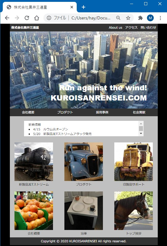 というわけで、改めて全体を表示すると以下イメージのようになります。これで完成。なかなかカッコよくできました。 ![]() ところで一点。CSSグリッドは古いブラウザやIEには対応していません。なので古いブラウザを使う人やIEユーザーをターゲットとする場合は違う方法が必要です。例えば、フレックスボックスを使う方法。今回と同じデザインなら要素のdivボックスを3つずつボックスに入れて表示を整えます。あるいは、<table>タグを使う方法ならもっと古いブラウザにも対応可能。横に3列、縦に2段の枠線なしの表を作って各セルに画像と説明ワードを割り当てれば実現できます。特殊ブラウザ対応(特にIE対応)はウェブデザインでよく問題になります。頭の片隅に覚えておきましょう。 オリジナルデザインに向けてここまででウェブページ作りの基本は一通り確認しました。でも大事なのはここから。皆さんがやらなければならいのはオリジナルデザインのウェブページ作りです。この最終ページで作成したサンプルをベースに、少し修正するところからやってみましょう。